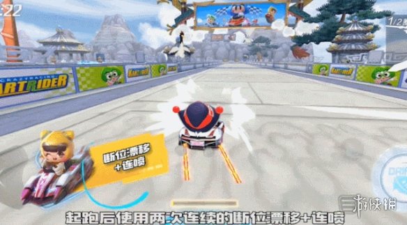 所以在起跑后,可以使用两次连续的断位漂移,同时配合使用连喷,在到达第一个弯道前,集满第一个氮气。存下的氮气将在后面复杂赛道使用,争取宝贵的时间。