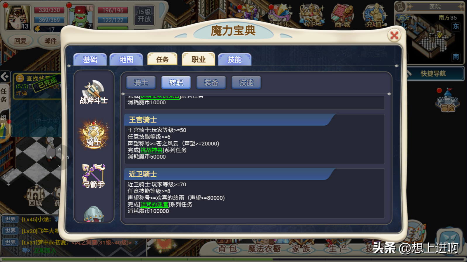 王宫骑士:玩家等级>=50任意技能等级>=6声望称号>=苍之风云 (声望>=20000)完成[挑战神兽]系列任务消耗魔币50000