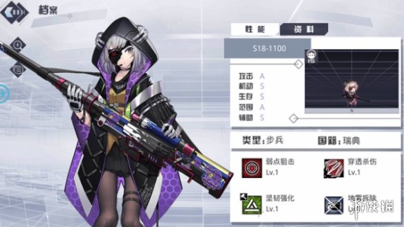 三S的属性值,是一个瑞典的步兵,使用的是一把威力强大的狙击枪,拥有很强的反炮塔能力和排地雷的能力,可以同时攻击多个敌人,是队伍中不可缺的一个角色。