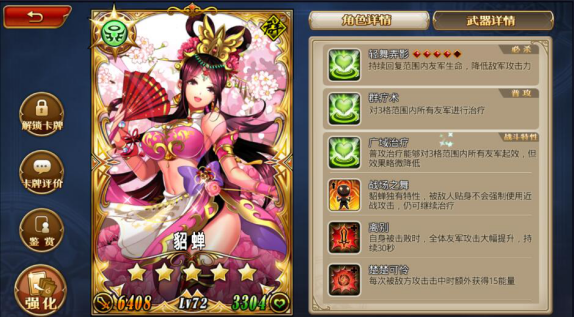 与其说辅助,但目前来看,最大的作用就是奶,花样奶,单体的,群体的,范围的,全军增加的。总之与其说是辅助80%以上的功能都是回血与续航,奶的另外还会掺杂各种各样的增益或减益类技能。例如加伤害的(张泓),加防御的(华佗),削弱攻击力的(貂蝉),总之各种各样,有待你的选择。辅助万金油貂蝉,和袁术一样,几乎适用与一切战斗,如果可以的话,这个武将一定要拥有。