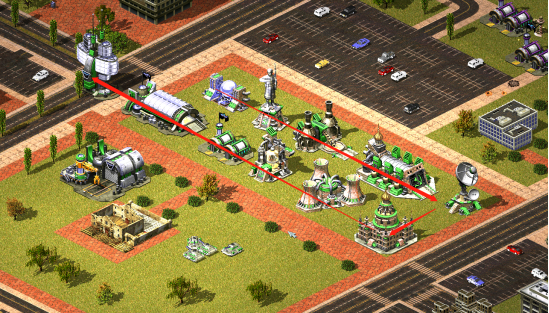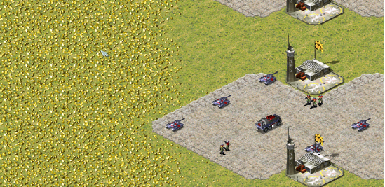 盟电——盟兵(狗探路)——盟矿(采富矿)——空指——巨炮(利用拖动的苏军基地车在中间放下)——苏矿(盟军牛采完最后一车矿飞到中间交矿)——苏兵——第二巨炮或防空——苏重(开始出犀牛)