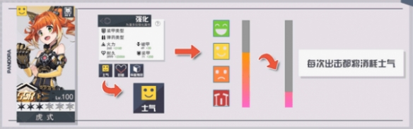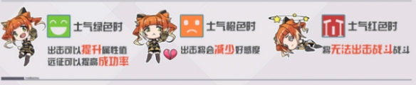 当士气是绿色的笑脸时代表出击可以提升属性值,远征也可以提高成功率,可以大幅降低自己攻略关卡的难度。当士气是橙色时,出击就会减少好感度了,建议不要出击了。当士气为红色哭脸时就将无法出击战斗了。