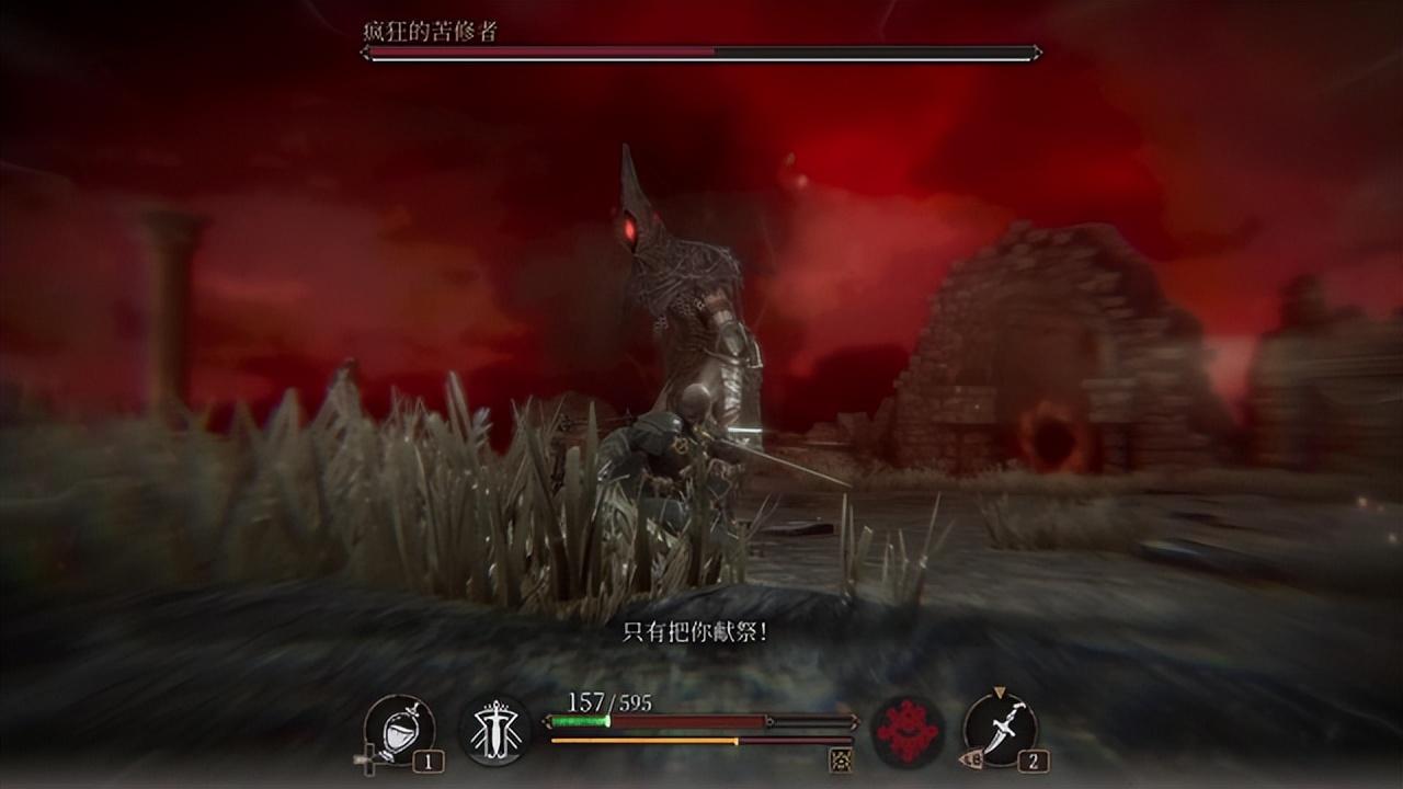 而在boss战中,队伍角色的理智值是共享的,假如不慎理智归零陷入“崩溃”,则会直接使boss进入狂暴状态,也就是二阶段,并且会恢复一定血量。当我第一次面对新手村boss时不慎“崩溃”,画面渐黑,再度亮起。血色天空映照下,苦修者扬起长鞭,污秽的气息变得猩红、躁动,伴随着他的怒吼,我惊讶的下巴跌到手柄上,最后殒命。这意料之外的展开瞬间拔高了整个游戏在我心中的期待。
