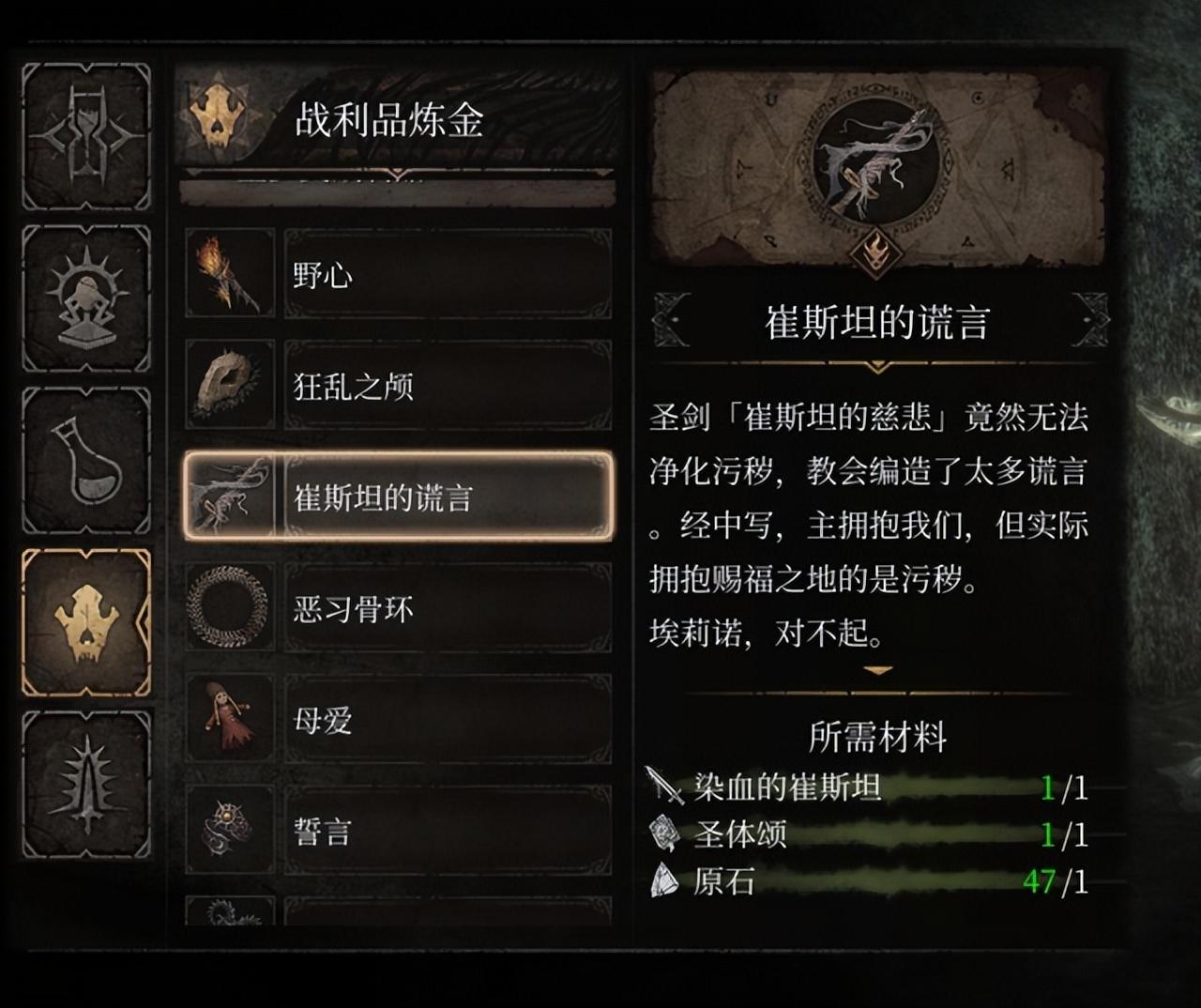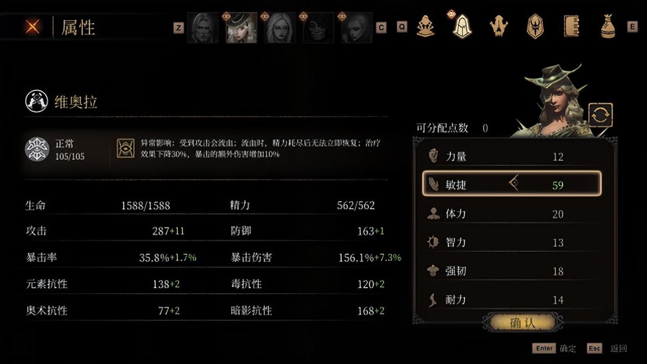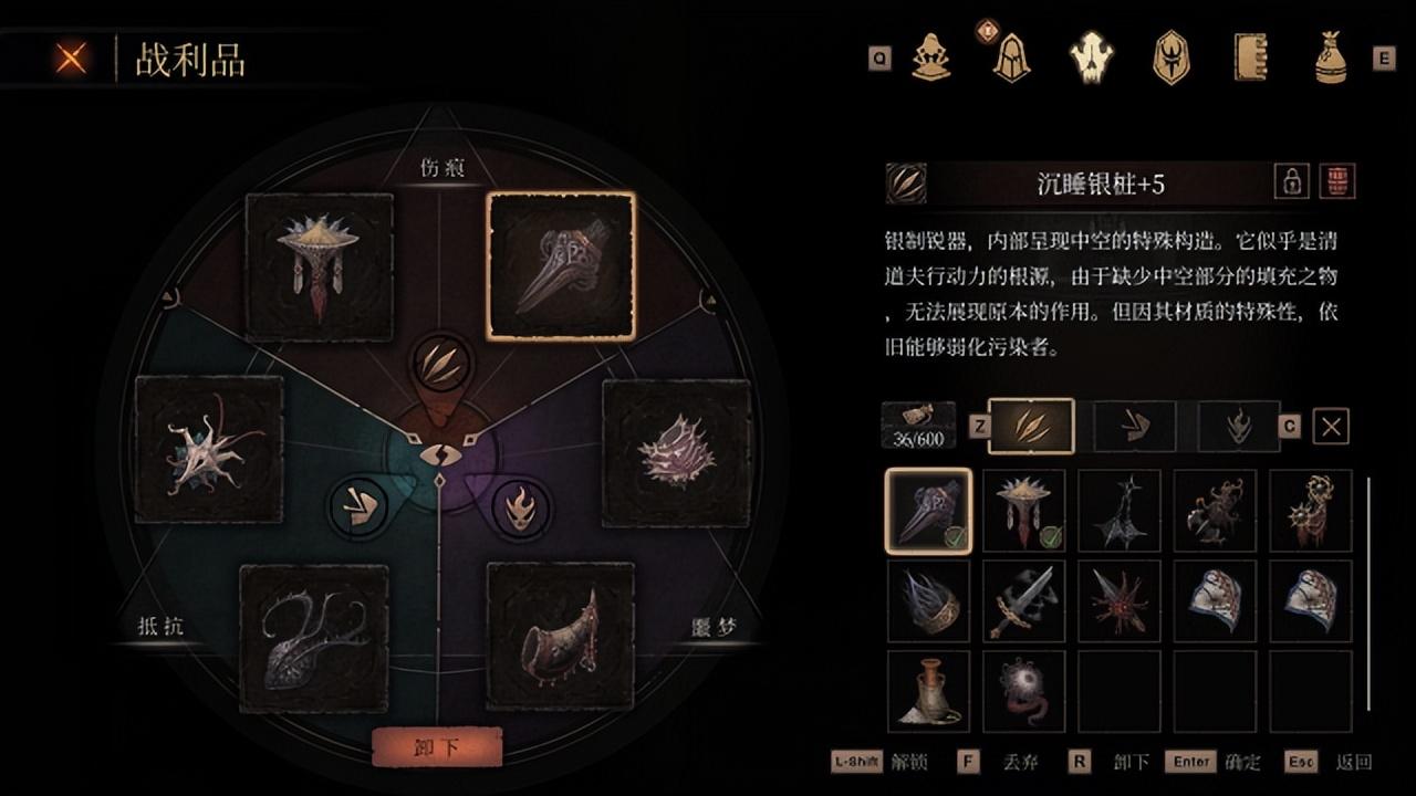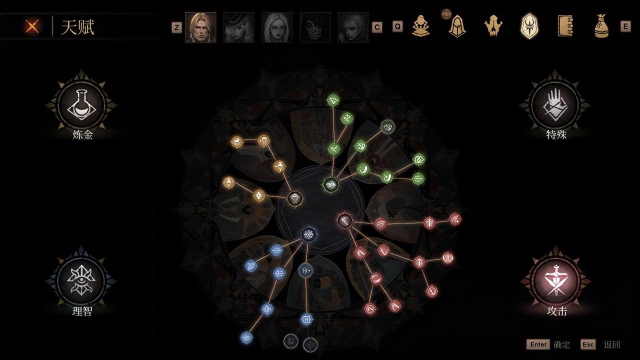 “炼金”主要血瓶和药水的增益;“理智”主要是提升理智值,并强化异常状态下的效果,弱化负面效果;“特殊”与“攻击”则是角色的独特被动和战技。