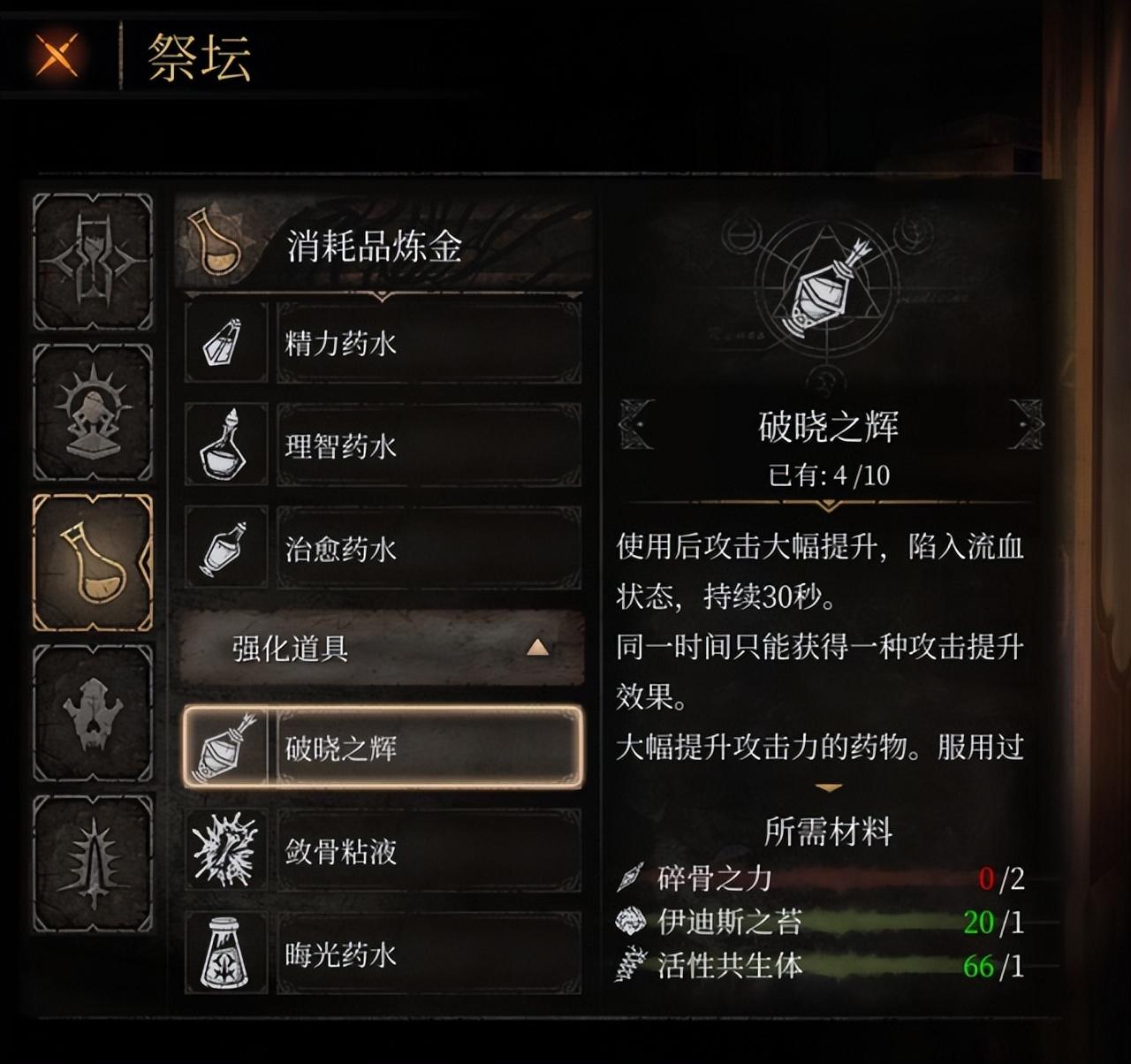 骨粒的另一作用就是用来交易,购买素材或者道具。游戏中的道具相对游戏体量来说还是较为丰富的,主要分为恢复增益药水和战斗类的投掷物。和其他魂类游戏一样,这些道具都很稀少,药水的增益与投掷物的伤害削弱通常也不太明显,而且持续时间短,不过《帕斯卡契约》里你还可以通过反复刷取材料,在祭坛制造它们,在游戏中后期也可以在贝妮塔处祝福,来延长药水的持续时间,还有概率解锁高级药水的配方。