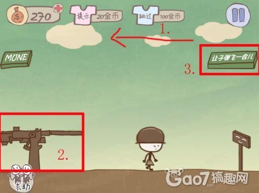 1.将MUNE向右拖然后会出现让子弹飞一会的按键。2.点击枪让子弹射出然后迅速点击让子弹飞一会。小贱货就会自己逃掉