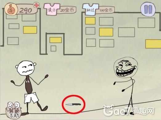 进入这关后我们首先是点击小刀抢到它然后杀死敌人。在杀死敌人坑货就会说:“完了被发现了!”。这时候我们就要按设备HOME退出到设备桌面然后在进入到游戏即可通关。(注意:是退出到手机桌面而不是游戏菜单页)