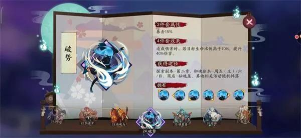 这套御魂可以说是最常用的搭配之一了,其不仅可以加强苍风一目连的输出能力,同时还可以提高风盾的保护能力。但需要注意的是该御魂套需要满暴,而其攻击、爆伤越高越好。