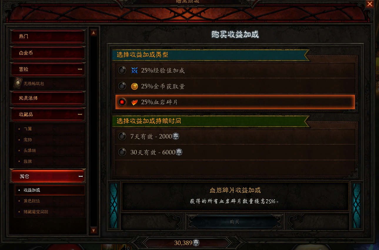 4.暗黑3国服的白金币可以拿来买飞翼、宠物、旌旗、经验 金钱获取 血岩碎片收益加成。这里推荐买血岩碎片和经验收益加成。