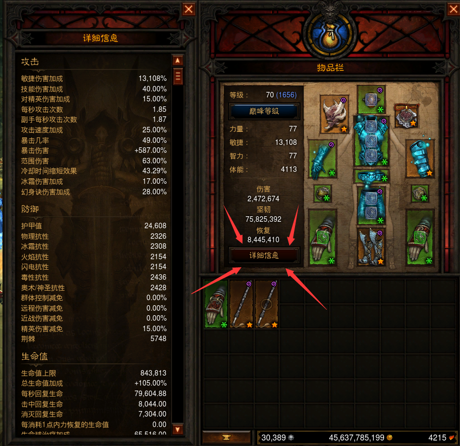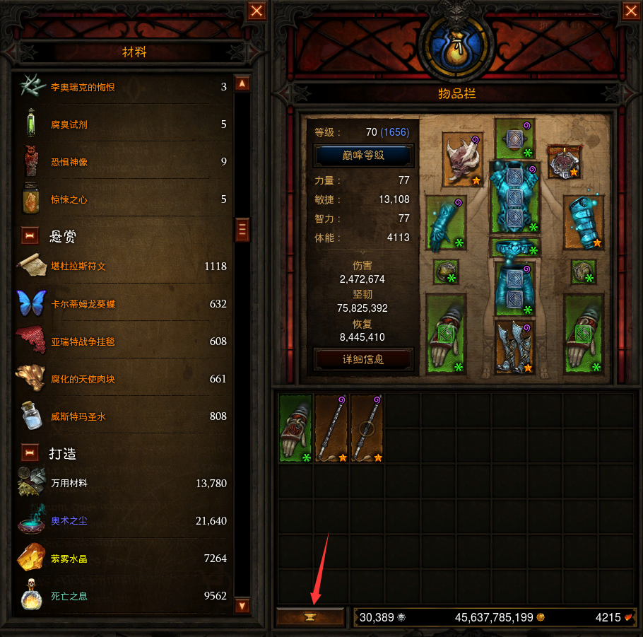 15.按C打开人物和背包面板,可以查看人物属性各项详细信息和获得的各种制作材料。