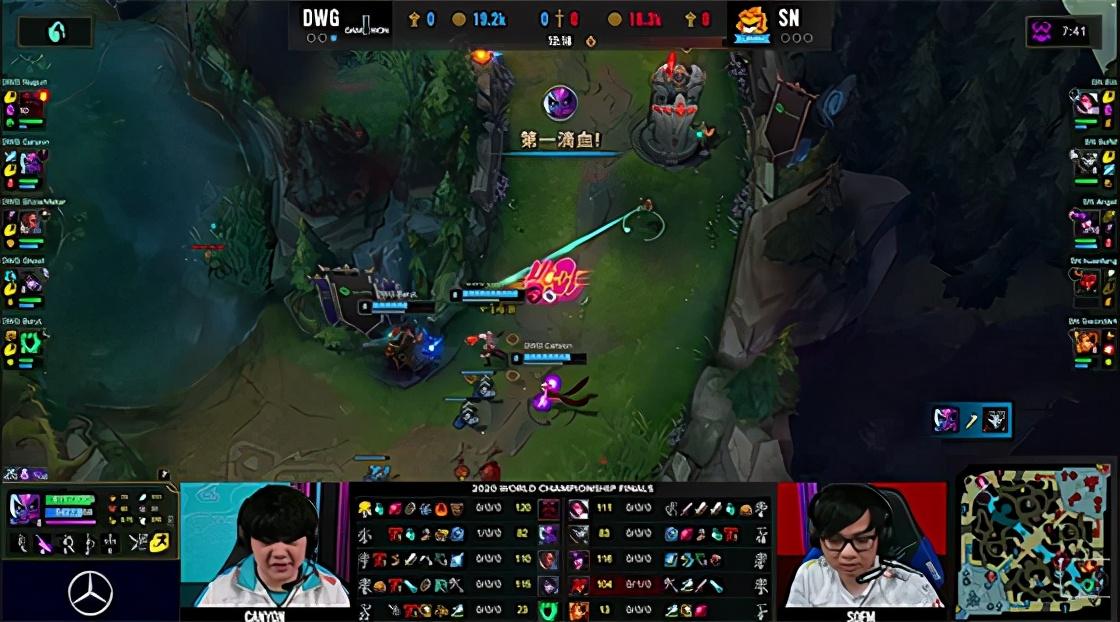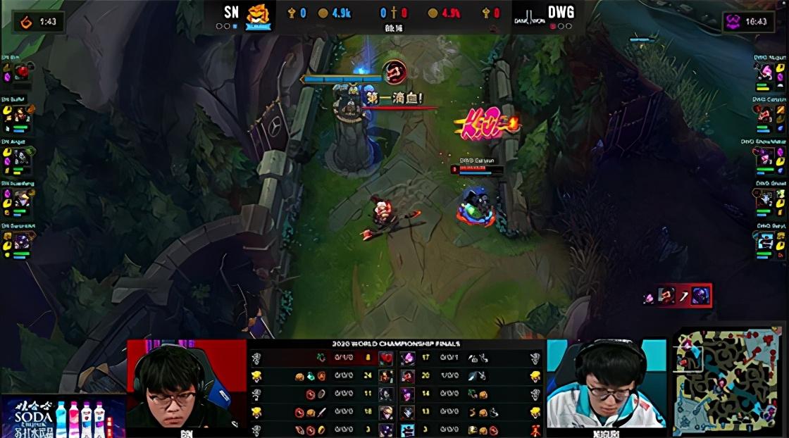 开局双方打野都从自家上半野区起手,DWG下路组抢到2级后潘森的闪现换掉蕾欧娜的引燃,女警一人就把SN双人组压在塔下,潘森帮千珏做好小龙河道的视野回线对拼,厄斐琉斯使用坠明禁锢到女警,蕾欧娜接控制但被女警净化秒解,潘森挂引燃单杀厄斐琉斯拿到一血。