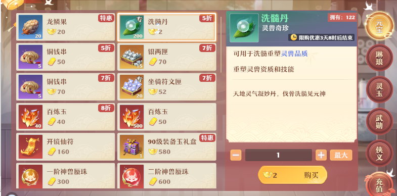如果你是三卡党(战令、月卡、基金),那么元宝数量有限,可得省着点用。尽量不要为了购买一些平价道具而去兑换银两,元宝主要用来购买一些5折及以下道具。做一个“屯屯鼠”未尝不可,遇到心动的再下手。元宝商城中每周折扣的洗髓丹可以买一点,洗髓都是要走这一遭的。如果缺少铜钱可以购买一些恢复活力,进行采集、捕捉、钓鱼、丹道、厨艺、符法之列的生活技能,制造产物出售获得铜钱。