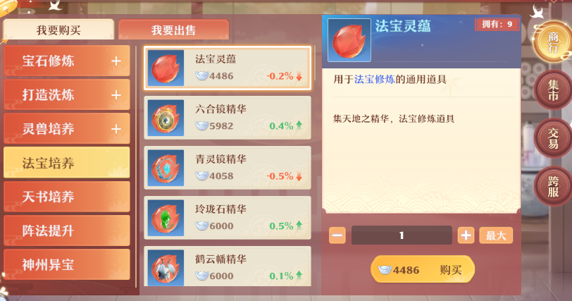 所谓买得好不如买得巧。相信你也注意到了,交易行的商品价格是有波动的,在低价的时候买入一些道具,也是省钱了。像是阵法要诀、法宝灵蕴、神兽玉诀、装备玉。