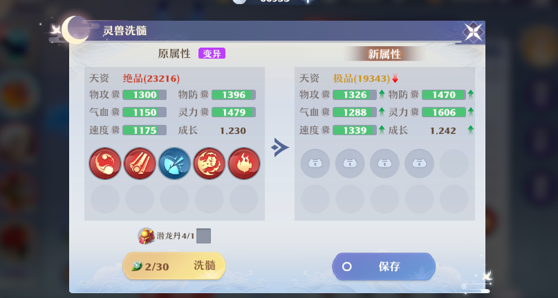 最后游戏中有许多与概率相关的养成内容,像是打装备、洗髓、洗链子、打书、法宝血炼等等,虽然有保底机制在这里,但对于新手来说没有一定的资源储备,切忌上头。就拿灵兽来说,也不是非得追求完美,变异了,主属性OK,技能少1个也可以先用着,不急于一时。