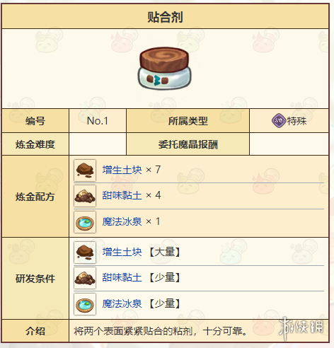 贴合剂的研发需要甜味粘土(少量)+魔法冰泉(少量)+增生土块(大量),研发成功后制作需要7增生土块+4甜味黏土+1魔法冰泉。