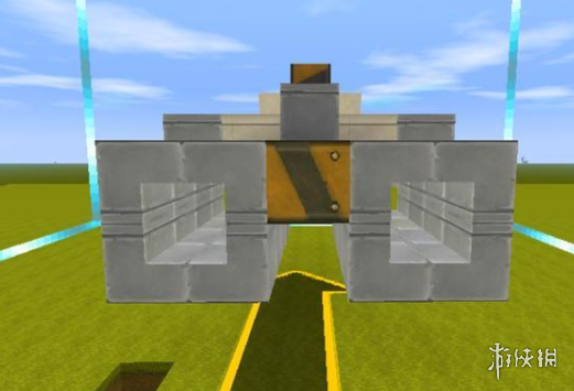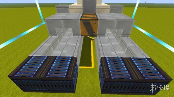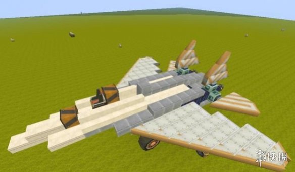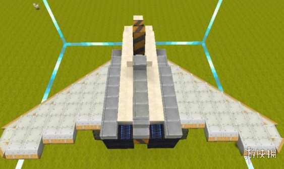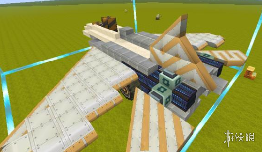 4、再在进气通道的后方用星球岩楼梯建一半的进气通道,后方和上方用电石铁板封死,接着前面继续搭建机身。