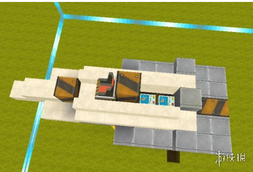 1、首先放一个机械车间,在距离地面4格高处用半砖和楼梯搭建飞机的机头部位(注意因为飞机比较大,搭建时要看准机械车间的中间线),并且机头要贴近一个边。在上面放一个无限引擎和驾驶座。