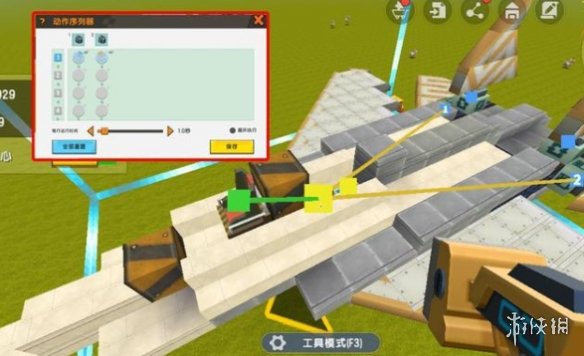 7、用连接器将侧面的两个转轴方块与动作序列器1连接,再把动作序列器1与驾驶座连接,点击动作序列器进入设置界面,将第一排的旋转数值调整为45°和-45°,运行时间调整为1秒然后保存。再将尾部上方的两个转轴方块、动作序列器2和驾驶座连接,点击动作序列器将第一排的旋转数值调整为30°和30°,运行时间同样调整为1秒然后保存。
