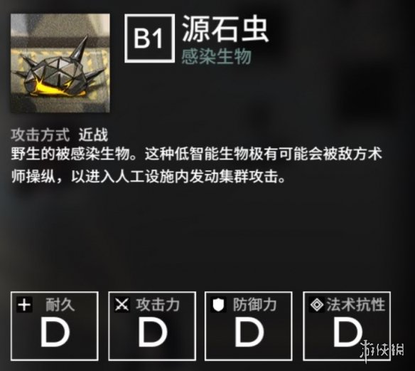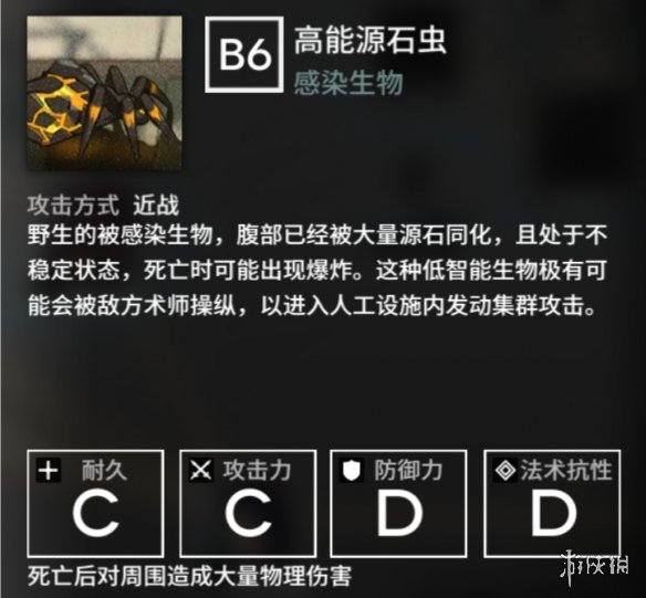 会在死亡时造成一次AOE爆炸伤害,大约是以自身为中心,一个地图格子对角线为直径的圆。面对这类敌人时,除了远程输出提前击杀外,也可以通过临时部署砾、红这类再部署时间短的特种,或是玫兰莎这种高攻近卫单挑解决。或者部署重装拦在主要防线以外,远程趁机输出消灭。如果不得不接敌,也可以把干员部署成“X”的交错形状,避免自爆虫死亡时对大量干员造成伤害。