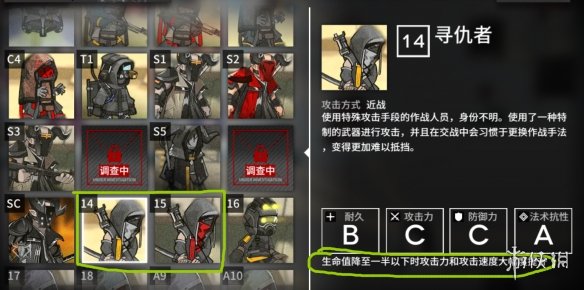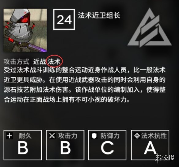 敌人拥有耐久、攻击力、防御力、法术抗性四种基本属性。如下图所示,情报中只会显示敌人这项属性的评级,具体数值则需要进行测试评级最低为D,最高为S,且有D+这种评级形式,表示比D高但是比C低。