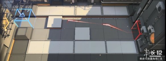 例如下图关卡SK-4。在游戏开始时,会有术师移动到下图中的位置。此时,被红色线框出的区域中一旦部署干员就会受到术师的攻击,从而限制我们开局的部署空间。