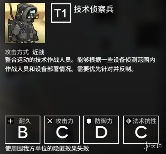 比如说技术侦察兵会使他周围的干员的隐匿效果失效,包括草丛带来的隐匿效果,导致原本不会被攻击的干员被攻击。