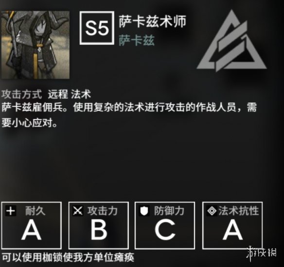 拥有只能使用一次的枷锁技能,会捆绑其攻击距离内最近的干员并使干员受到持续伤害,持续一段时间。被捆绑期间干员无法攻击和阻挡。可以记住萨卡兹术师出现的时间轴,然后部署干员承受萨卡兹术师的枷锁技能,解除萨卡兹术师最大的威胁。多个萨卡兹术师会对同一个干员使用枷锁。