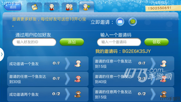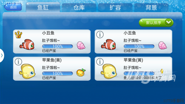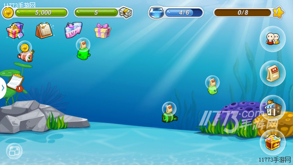 除了养成系统外,游戏还拥有并不复杂的社区交友系统,这个游戏也不例外。当然,游戏中并不仅仅只能让玩家傻傻的养鱼,游戏中也设有一些小游戏以供玩家在无聊的时候消磨时光。另外11773的小编在这里提示下:右上角显示你目前鱼缸的养鱼数量及最多养鱼数量和你的等级以及你升级需要的经验值。虽然流程很简单,但是游戏的公司很用心,添加了不少新的元素。譬如你想收获鱼儿的时候,如果觉得一条一条的去点,很麻烦,那就把你的手机摇几下,鱼儿就会自己产出宝物了。地上如果有一堆宝物的时候,想快速收获,怎么办?直接用手滑动宝物就可以了。
