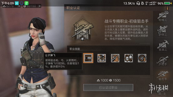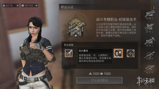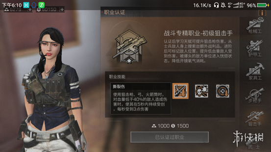 认证后学习天赋可提升狙击枪伤害,从士兵敌人身上搜索出额外战利品。进阶后可标记敌人位置,提升低血量敌人受到伤害,被爆头的敌方单位进入恍惚状态,降低开镜氧气消耗。