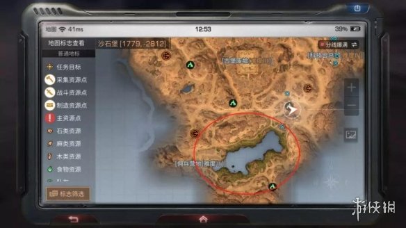 沙石堡地图上的两处绿洲,就是有水这片区域的岸边,动物,树和果子会集中在这一片区域。