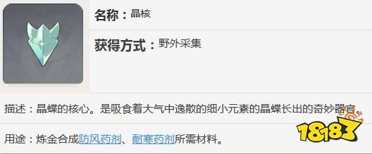 在原神游戏中,晶核的作用是用于炼金合成,可以用来合成浓缩树脂、防风药剂和耐寒药剂,晶核的获得方法在野外抓捕风晶蝶获得,风晶蝶是蝴蝶的一种,和蝴蝶不同的是风晶蝶周围环绕着风元素,普通蝴蝶抓捕后只能获得蝴蝶翅膀,不会获得晶核。