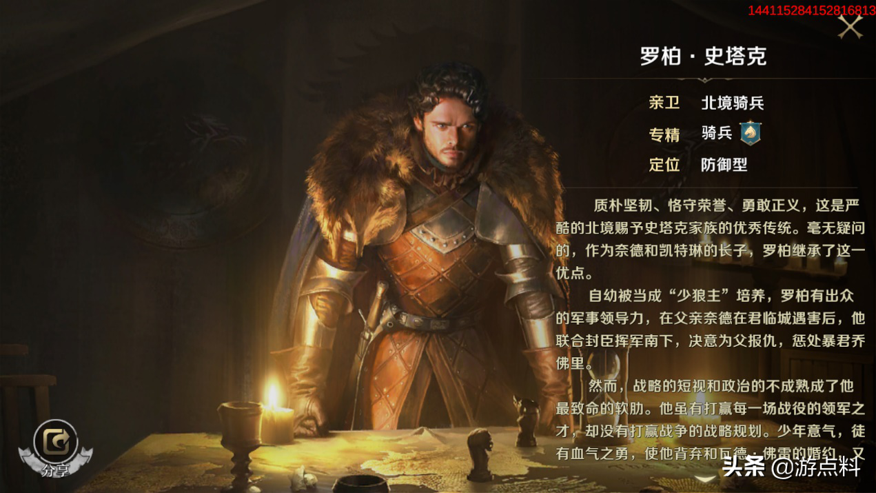 小编注意到,在原画等一系列的细节设计上,每一个指挥官(也就是经典角色)对原著IP的还原度都极深。以“少狼主”罗柏·史塔克为例,原画中还原了他征战君临的一幕:在军营中彻夜思考战事,背后的冰原狼图腾也象征着他的特质。除了原画,还辅以人物生平简介,这让老粉丝倍感亲切,而初次接触权游的玩家也能体会个中故事。