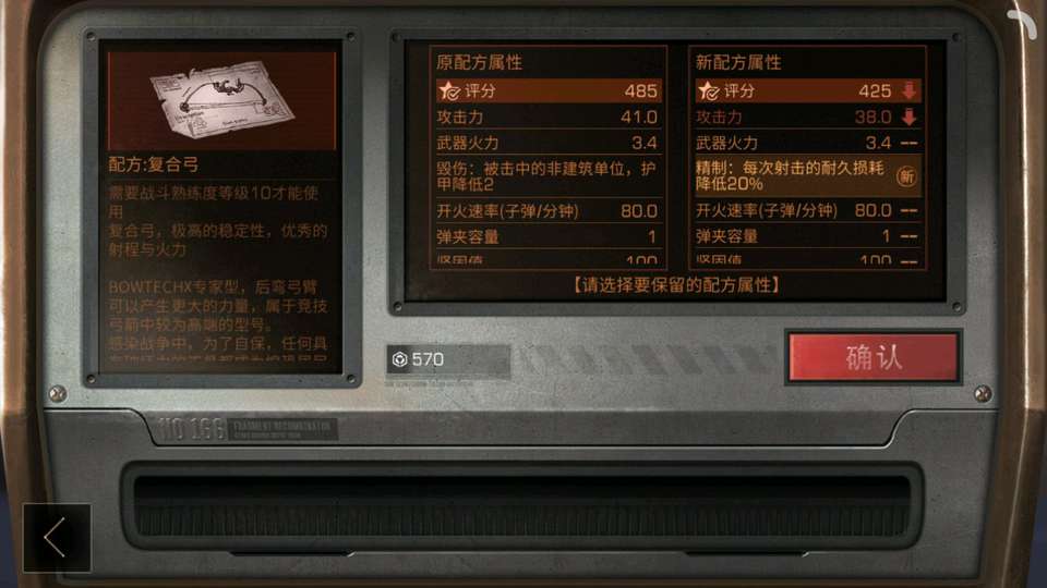 3、配方残页主要用来合配方,但是看运气。前期的配方基本都是过渡用的,喷子也好复合弓也好,只是一段时间用的。但是配件是可以拆下来且一直可以使用的。推荐配方等5级或者更高庄园的时候再刷。