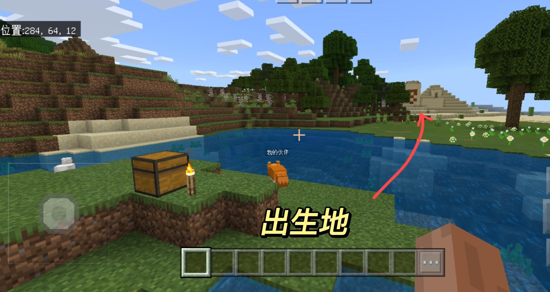 首先我们创建世界,输入地图种子代码31680,然后进入世界之后,出生地就在这个地方,旁边就是沙漠神殿了。