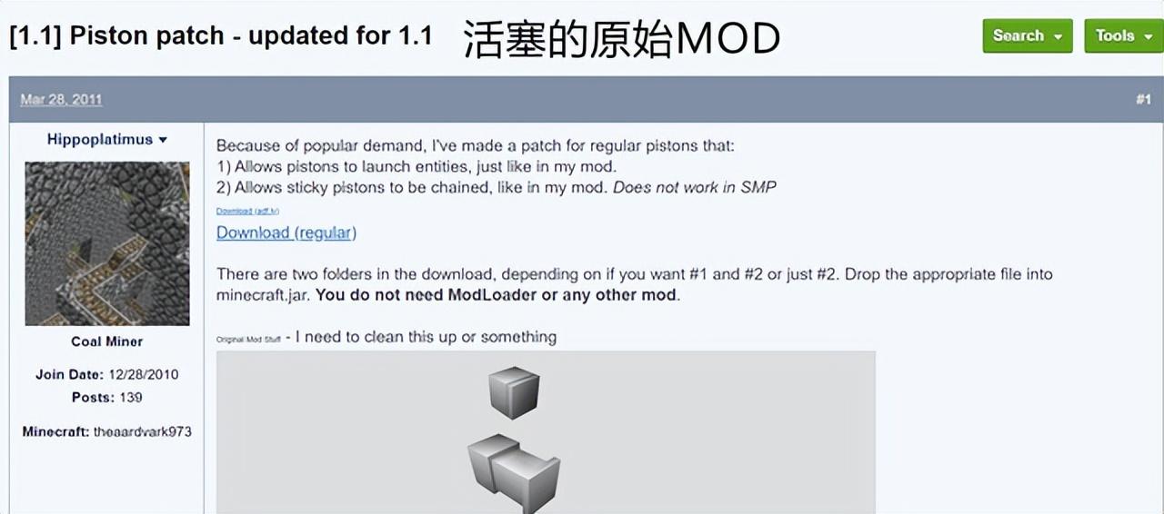 其实关于活塞的出现,可以这样和大家说,活塞整体都是官方“抄”的。你以为是Notch或者jeb的创意,事实上整个设计的概念,以及代码都是抄别人的。“活塞”最早的出现事实上是某位玩家在Minecraft论坛上发布的一个MOD。