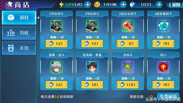 接着就该谈游戏的付费点了,毋庸置疑的是,这是一款F2P(free to play)的手机游戏,内置了商店系统,采用的是体力、金币和钻石三种模式的经济系统。其中体力主要用于副本闯关,金币主要用于成长系统的消耗,钻石则是与RMB等值的虚拟币,对应的充值兑换比例为10:1,购买力处于中等的水平;商店里则主要出售各种属性因子、机体碎片和各种资源礼包等等。