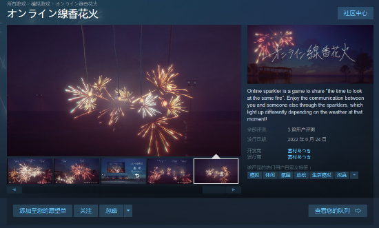 烟花模拟器《线上花火(オンライン線香花火)》Steam平台发售,售价为19.8元,可支持20人联机观赏烟花。