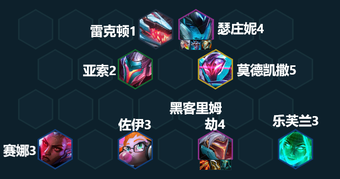 阵容组成:雷克顿、瑟庄妮、亚索、莫德凯撒、赛娜、佐伊、劫、乐芙兰