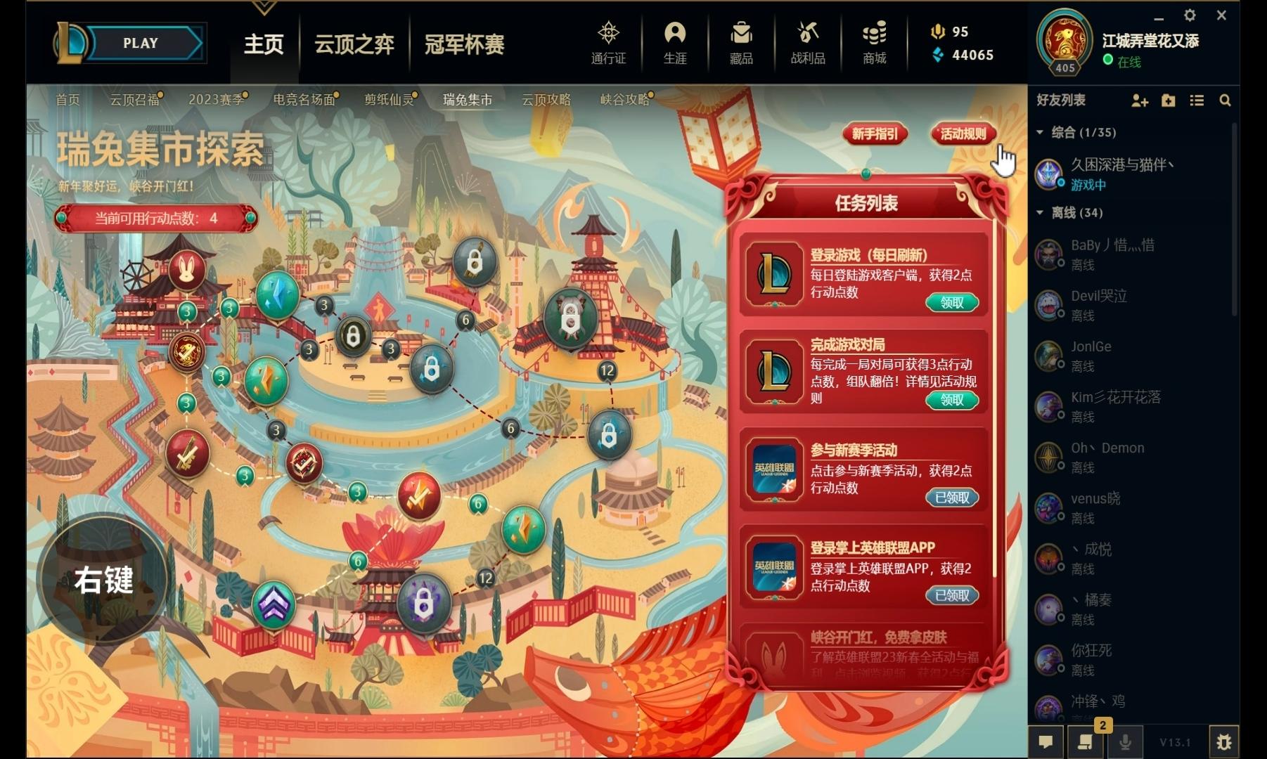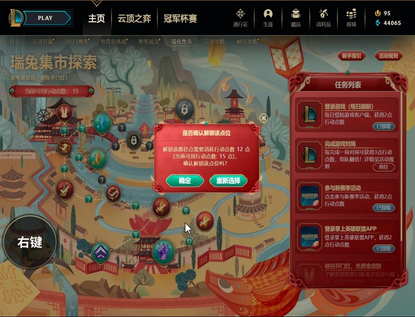 客户端首页最上面有个瑞兔集市,直接进入右边有任务列表,就是一些登录掌上英雄联盟、完成对局,和点一点活动主站、视频的任务,很好完成。完成后去找神话精萃所在的那一条路线,从前往后点就行了,我两天就拿到了。