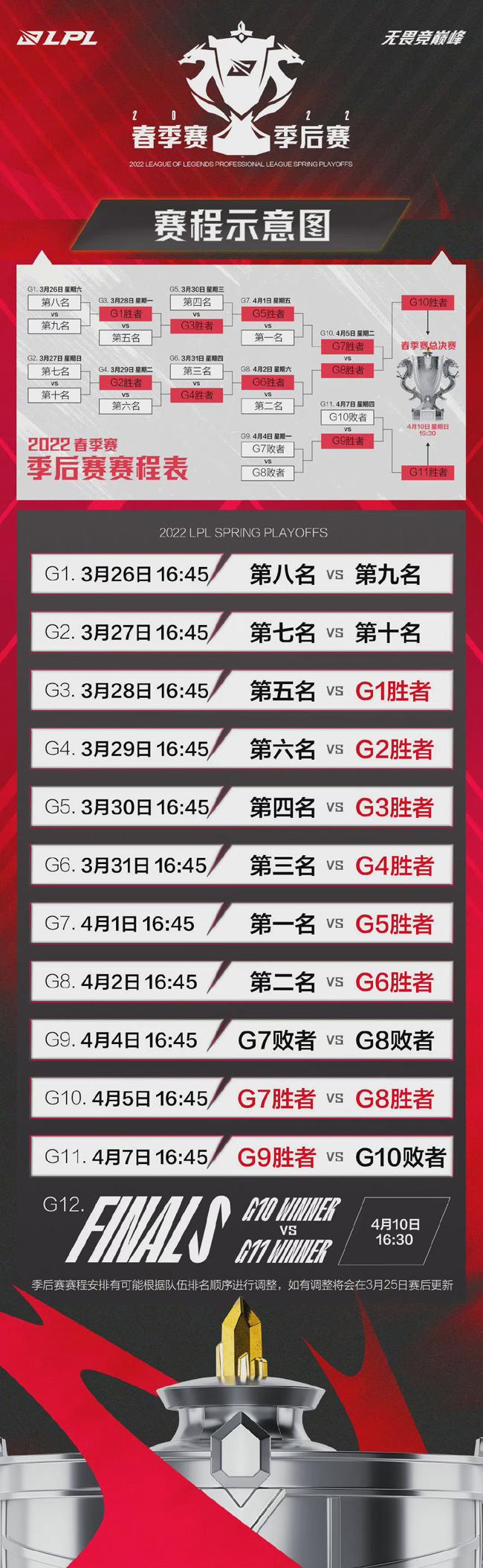 历经十周激烈争夺,2022LPL春季赛常规赛落下帷幕,V5、RNG、JDG、LNG、TES、WBG、EDG、BLG、RA、FPX十支战队成功挺进季后赛,将于3月26日即刻出发,一起向着银龙冠军奖杯的发起挑战。LPL精彩不停,敬请持续关注,无畏竞巅峰!