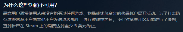 Steam官方为了避免有恶意用户向其他用户发送垃圾邮件、进行敲诈或钓鱼,对于Steam的部分功能,限制了必须要消费至少5美元的账号才能使用。