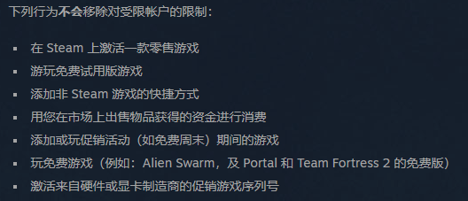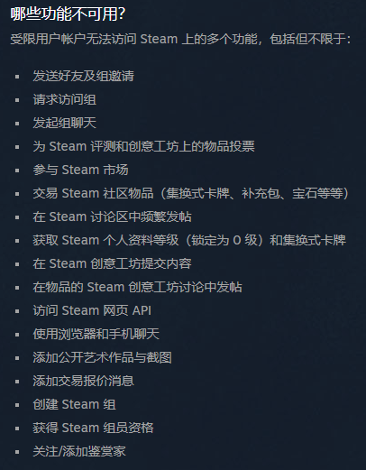 被限制的功能,除了添加好友,还包括创建Steam组、发起组聊天、参与 Steam 市场、在 Steam 创意工坊提交内容、发帖等等,可以说是非常不方便。