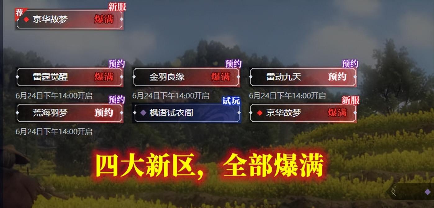 随后就连金羽良缘、雷动九天和荒海羽梦这三大服务器,也出现了曾经在其他服务器大获成功的五风联盟和红衣家族等知名团队的身影,《逆水寒》四周年新区,在还未正式开启的情况下,就直接进入了四服全部爆满的盛况。