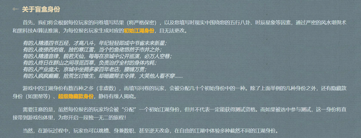 简单来说,就是玩家需要先完成一份测试问卷。这份问卷会围绕玩家的五行八卦、时辰星象等因素,通过严密的风水堪舆术和AI算法推演,为玩家生成对应的初始江湖身份,而且是不能更改的。因为游戏里的江湖身份有数百种,所以玩家不光能得到从乞丐到富商的不同社会阶层的身份,还能得到一些超级隐藏身份等,所以契合了“盲盒”的主题。每个玩家体验都可能截然不同,确实也是国内游戏圈首创。
