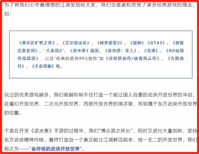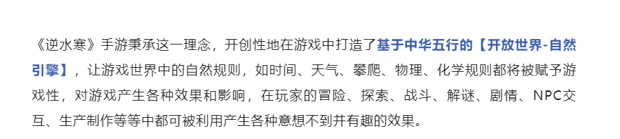 在玩法内容方面。官方也表示自己借鉴学习了国内外十多款大作的优秀内核。不光有着巨大的开放世界,还能做到“所见皆可互动”的高互动性。玩法本身也会契合中国传统武侠风,包括五行元素延伸的各种招式。以及更贴合武侠氛围的,模仿古人设计的NPC智能。以及堪比单机游戏的蝴蝶效应分支剧情等。