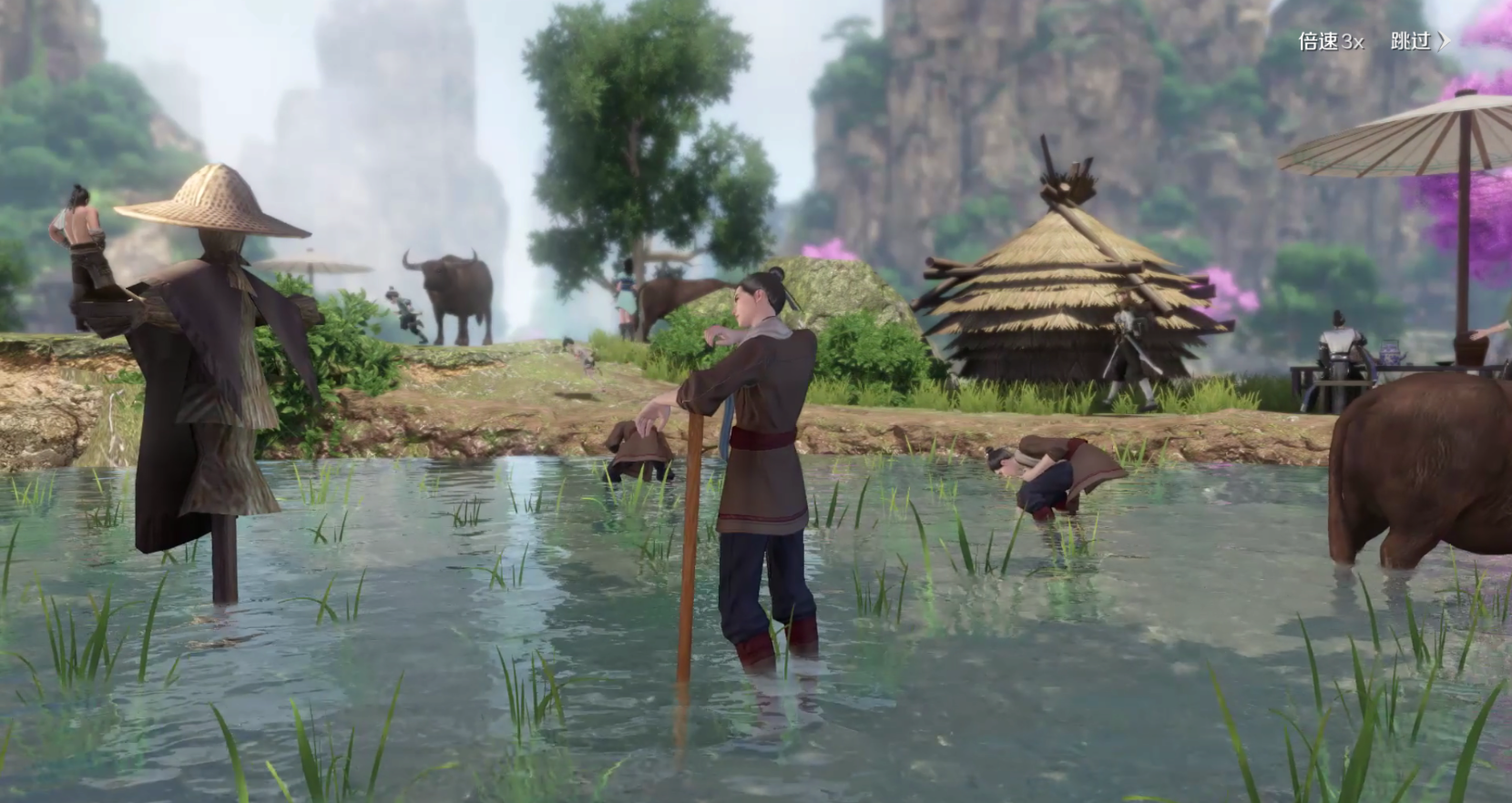 田间还有农民 正在插秧,旁边稻草人静静听着风声,老黄牛也被牵着在田间闲逛。