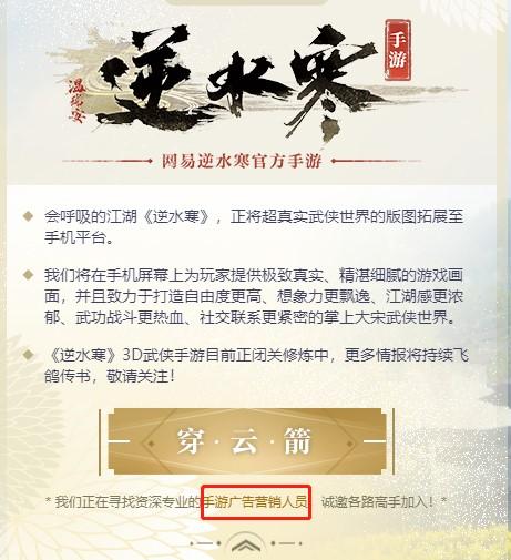 这也是《逆水寒》首次公开手游计划,首曝的官网直接放置了一张手游场景截图,并且自信地使用了4倍缩放供玩家查看画面细节,从这张图上看,《逆水寒》手游的画质精细程度,已经和《逆水寒》端游打成平手了!令人惊叹它将会给手游画面带来怎样的冲击,就如同《逆水寒》端游直接拔高了国产游戏画面门槛一样。不过《逆水寒》手游这次露脸仅仅是点到为止,并没有曝光更多信息,但官网上特别制作了一个“招聘专业手游广告营销人员”的板块,按照行业习惯,游戏完成度应该已经很高了,已经进入到招揽广告宣传岗位,谋划上市阶段了。