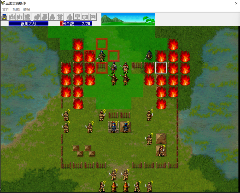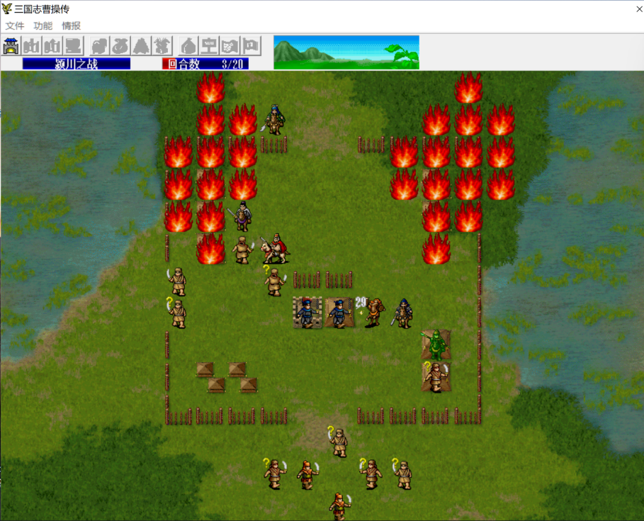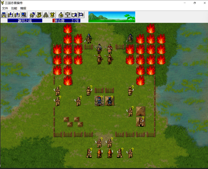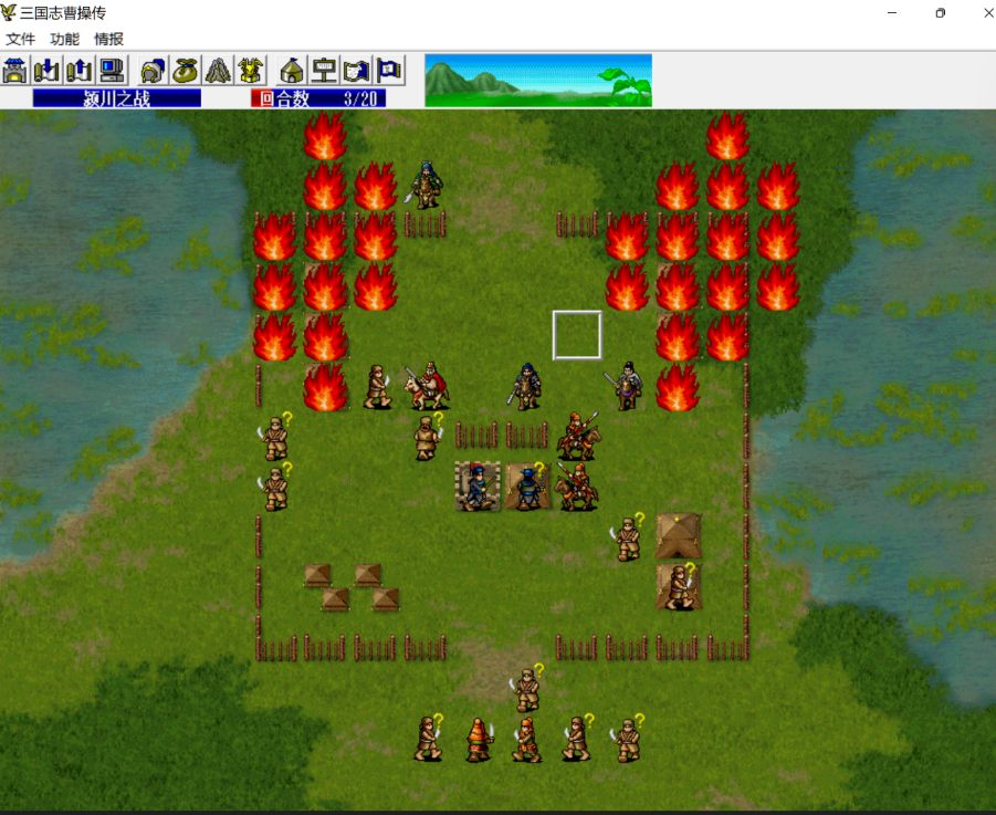 本回合继续小补给,等待左侧黄巾贼继续攻击我,然后获得击杀经验。友军回合时,刘备会走到我的左上方攻击黄巾贼。刘备攻击黄巾贼的命中率为98,经过大量的的SL,刘备面前的黄巾贼终于活了下来。张梁也醒了,和张宝一起放毒烟。
