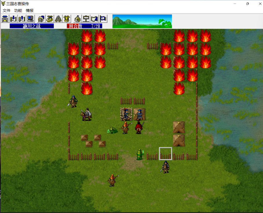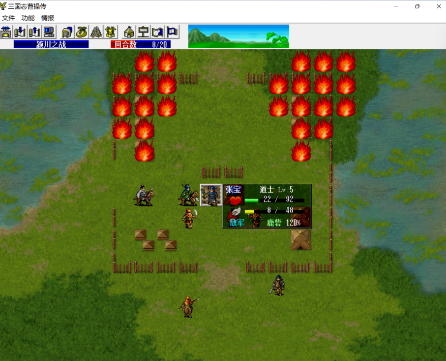 第7回合继续小补给,刘备和张飞收拾残兵,友军阶段,刘备给左侧步兵补给,关羽横冲过来给了张宝一刀,直接打残。敌军阶段,张宝肉搏杀死下方骑兵。张梁放毒烟。