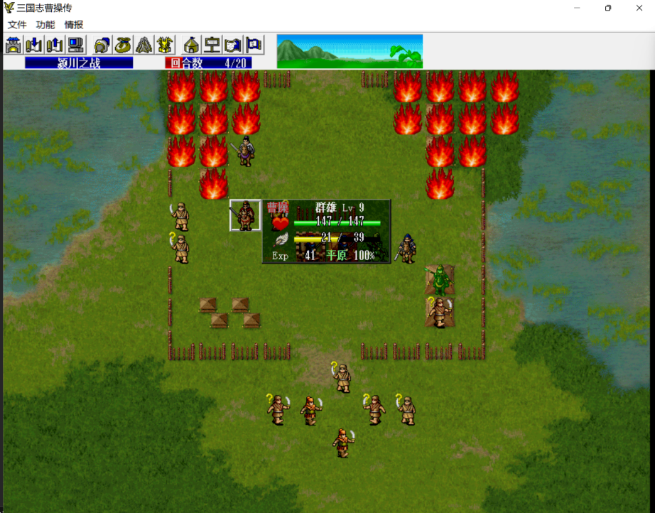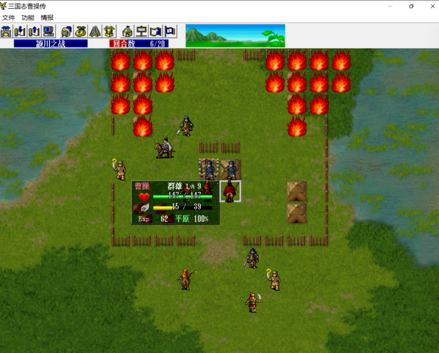 第5回合开始,左侧又醒了一个小兵,主动攻击曹操又获得1点经验。刘备将前方小兵打残,张飞和其他骑兵收拾右侧残局,这时需要站好位置,因为张宝,张梁两兄弟的MP值有限,所以再过几个回合他们只能跟我肉搏。